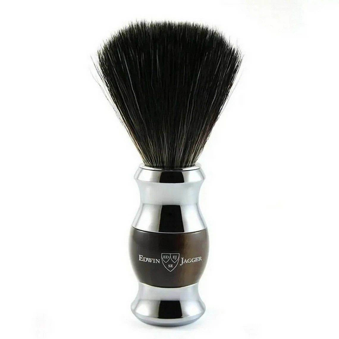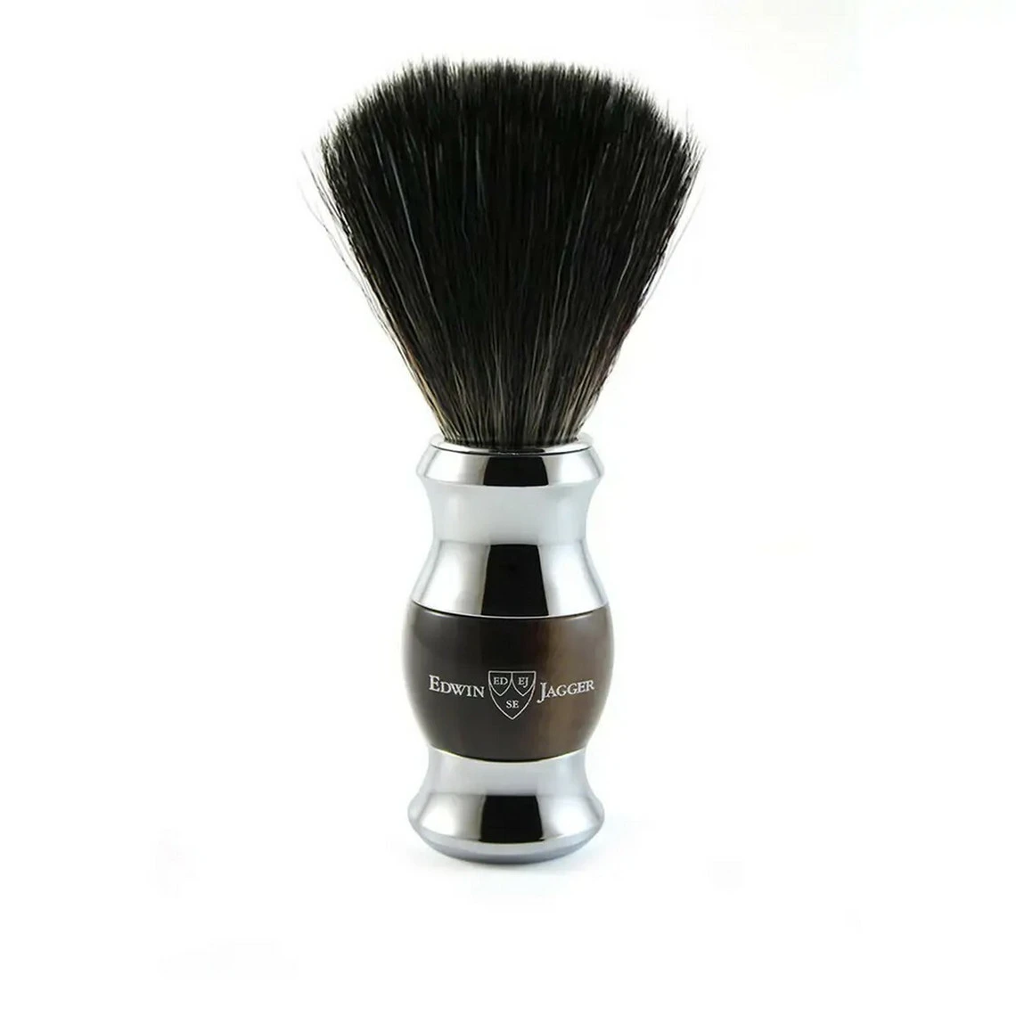 The Edwin Jagger Imitation Horn & Chrome Shaving Brush (Black Synthetic) is a high-quality, vegan friendly shaving brush. Synthetic fibre is an ethical, vegan-friendly, affordable alternative to badger hair. The black synthetic fibre retains hot water which, when combined with shaving cream or soap, can create a creamy lather that emulates the experience of using real badger hair shaving brushes, offering a comparable shave that is equally as pleasing. The handle of this shaving brush has a smart imitation horn appearance with chrome plated collar and end cap.