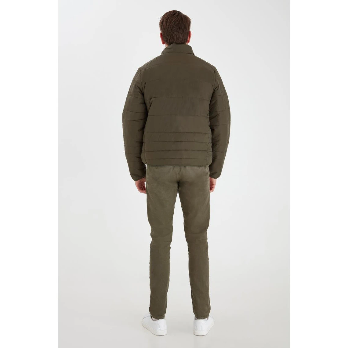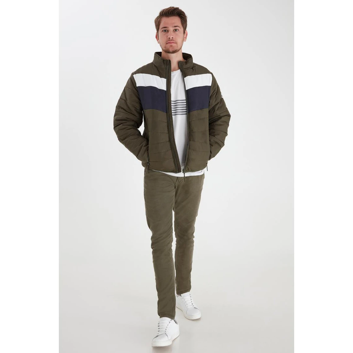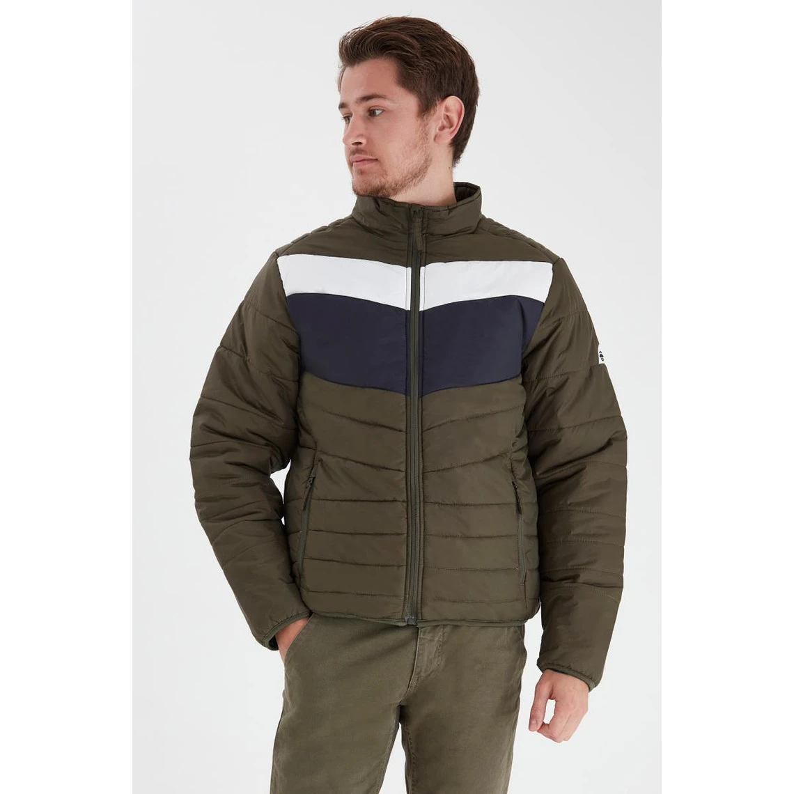 Doudoune tricolore à bandes, poches zippées, col montant.