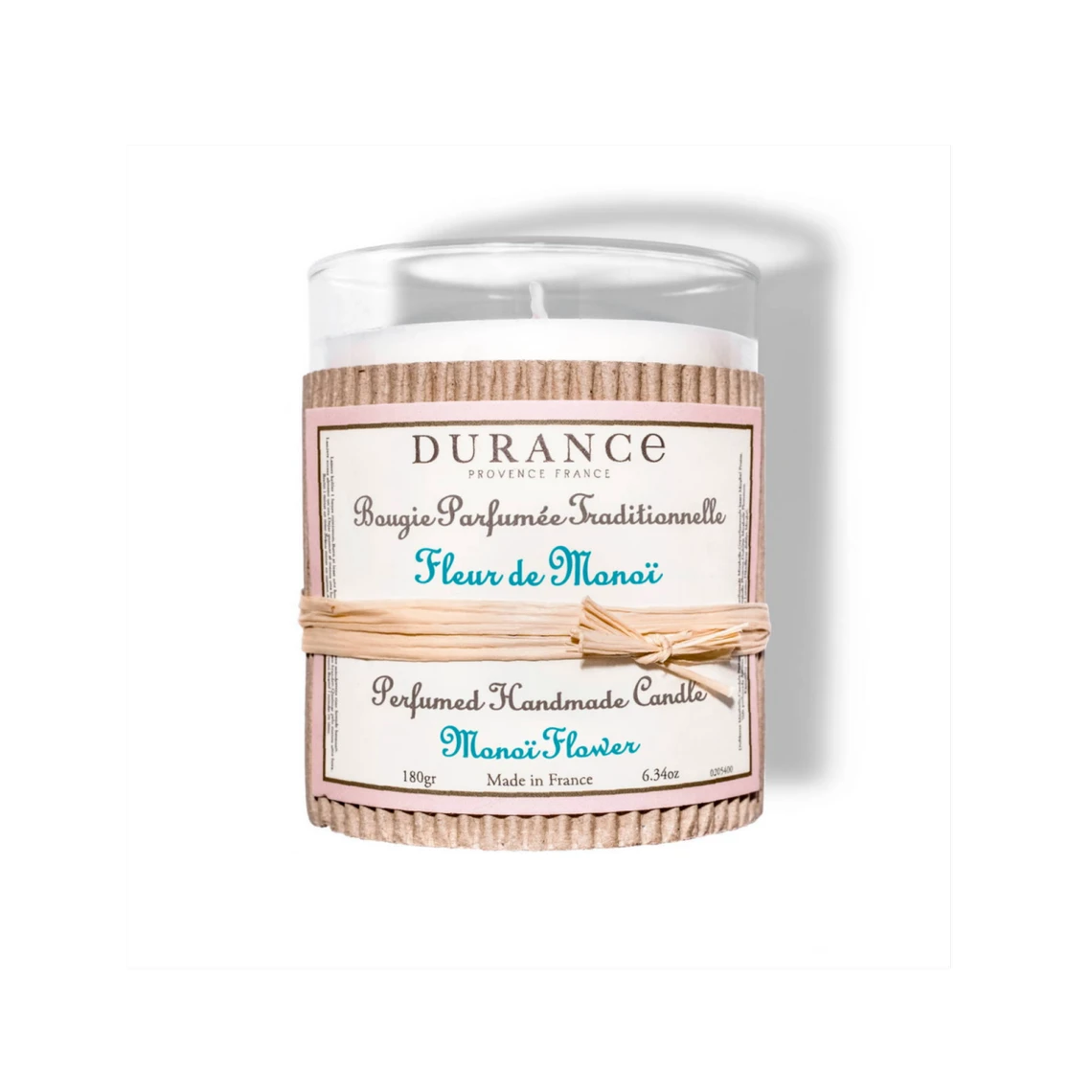 La Bougie Traditionnelle DURANCE Parfum Fleur de Monoi SWANN vous ramènera en vacances avec sa touche fleurie. L’esprit estival embaumera votre salon et vous rappellera vos journées à la plage.