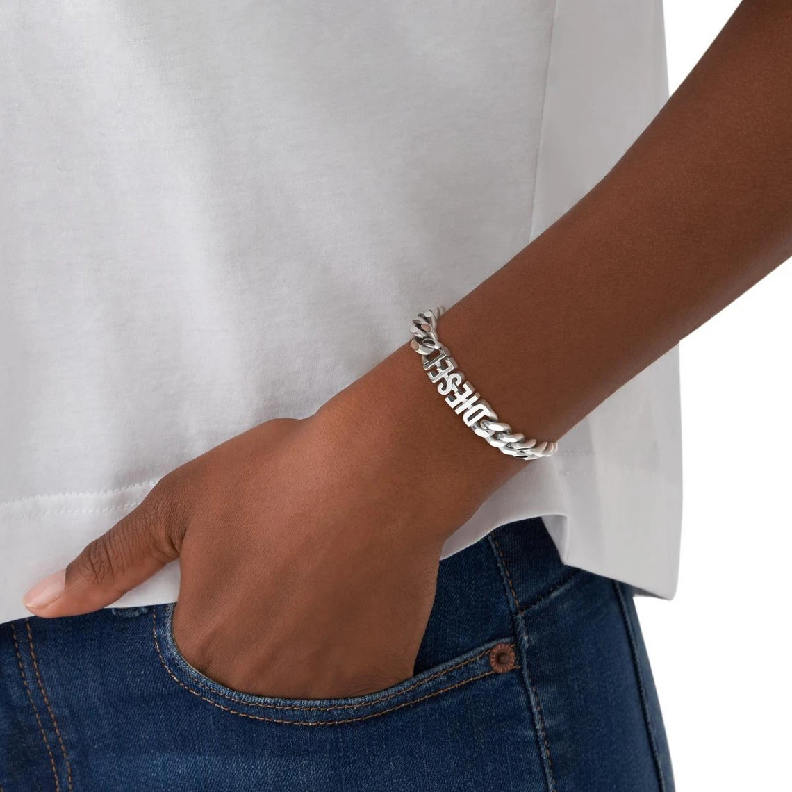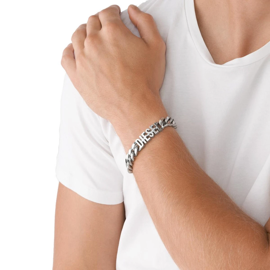 Ce Bracelet Homme en acier argenté de Diesel est un accessoire qui fera son effet sur votre poignet. Il plaît avec son originalité qui se reflète par sa maille gourmette portant les initiales de la marque. Discret et élégant, il ira parfaitement à plusieurs looks.