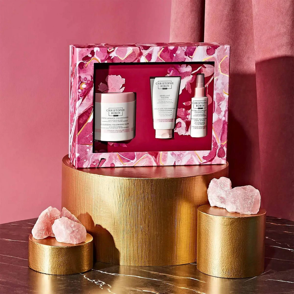 Découvrez le rituel volume de rêve Christophe Robin dans ce précieux écrin inspiré des vertus extraordinaires et de l’éclat du Quartz Rose, cristal connu pour représenter l’amour, la confiance et l’estime de soi. Ce coffret comprend une sélection de 3 soins volumisants subtilement parfumés à la rose pour apporter corps et volume aux cheveux fins et plats. Ce rituel complet magnifie les cheveux, ils sont rayonnants de beauté et vous aideront à retrouver assurance et audace.