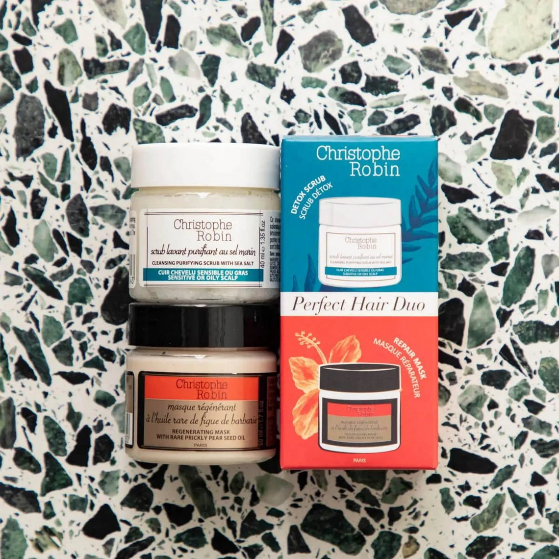 Votre routine parfaite pour des cheveux purifiés, somptueux et brillants des racines aux pointes. Contenu du coffret: ​ 1- DETOXIFIE: SCRUB LAVANT PURIFIANT AU SEL MARIN: 40ml – 1.3 US fl.oz : Ce shampooing traitant détoxifiant et apaisant exfolie, rééquilibre et revigore le cuir chevelu, une fois par semaine. ​ 2- RÉPARE : MASQUE RÉGÉNÉRANT À L’HUILE DE FIGUE DE BARBARIE: 40ml- 1.3 US fl.oz: Ce masque ultra-nourissant prend le plus grand soin des cheveux secs et abimés. Les cheveux apparaissent instantanément somptueux et fortifies au fini glossy lumineux.
