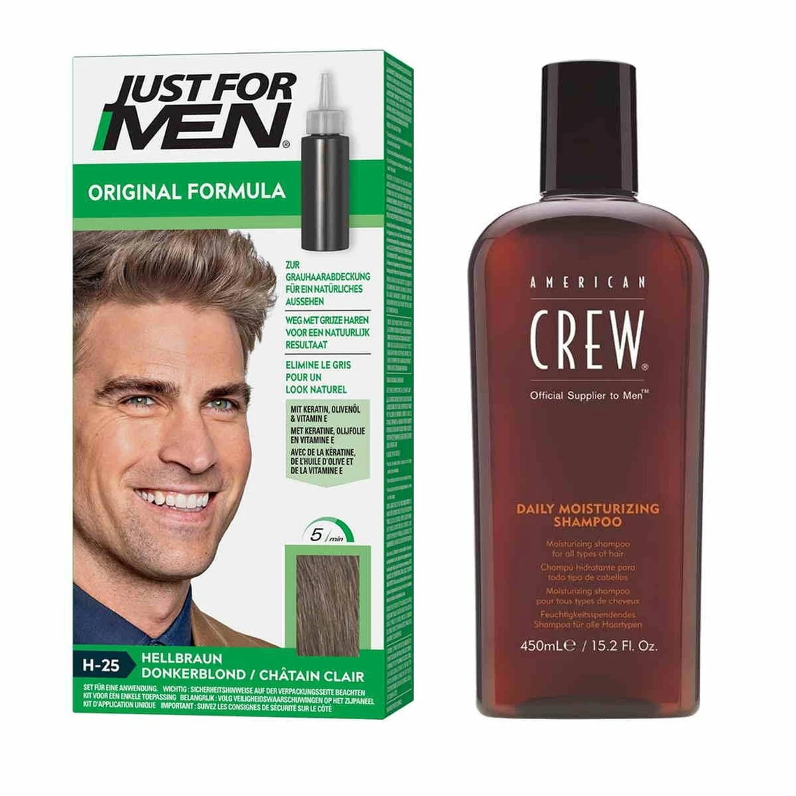 Le PACK COLORATION CHEVEUX & SHAMPOING vous propose une coloration cheveux homme Just For Men châtain clair et un shampoing DAILY MOISTURIZING SHAMPOO 250ML de la marque AMERICAN CREW pour des cheveux colorés et nourris !