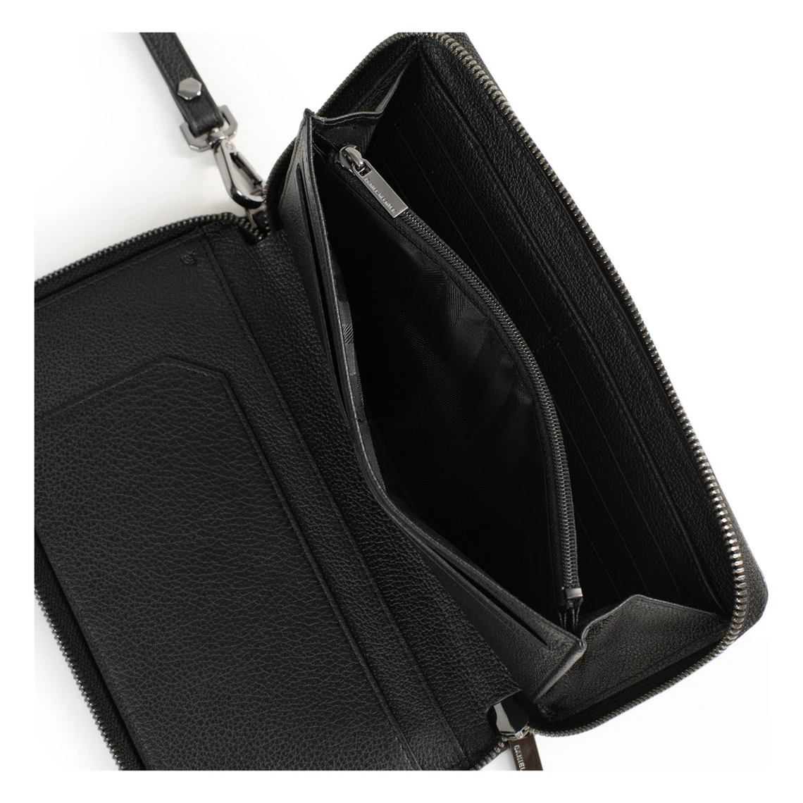 – Intérieur : 1 compartiment principal. 1 porte-monnaie zippé. 4 poches (dont 3 plates). 12 emplacements carte. 1 espace chéquier. 1 espace stylo.