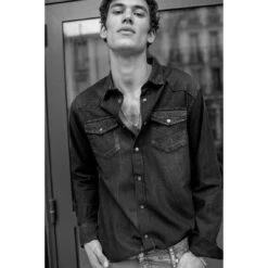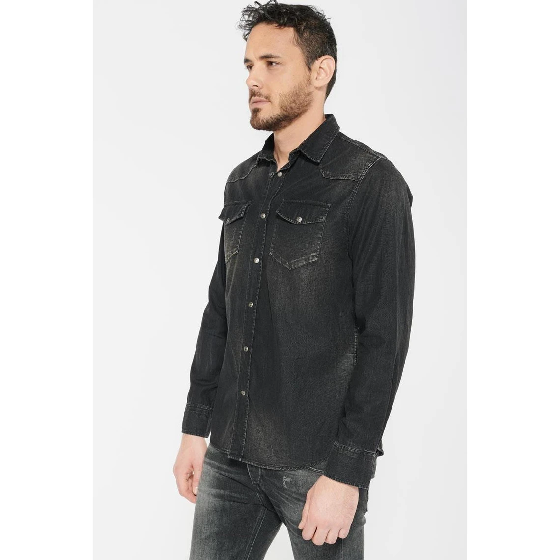 – Chemise en jeans noir délavée- Col chemise