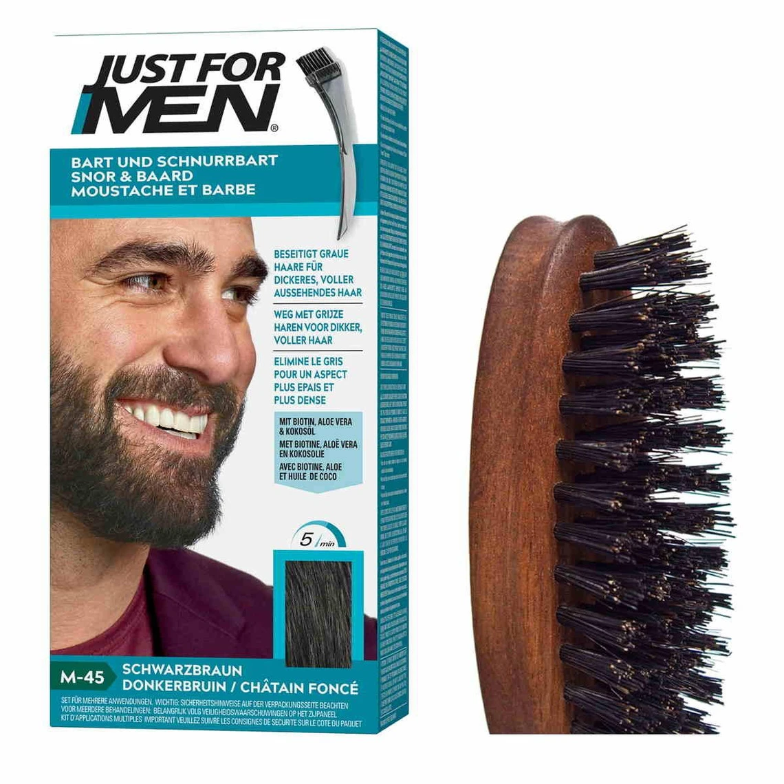 Ce PACK COLORATION BARBE CHATAIN FONCE et BROSSE À BARBE contient une BROSSE A BARBE de la marque Plisson fabriquée à la main. Elle est rehaussée d’un coussinet en latex. Son caractère antistatique lui permet de s’adapter facilement à tout type de barbe. La COLORATION BARBE CHATAIN FONCE de la marque JUST FOR MEN quant à elle s’utilise simplement et agit en 5 minutes pour une tenue longue durée. Sa formule exclusive True Color cible uniquement les poils gris et vous donne une couleur naturelle. Sans ammoniaque, elle respecte vos poils.