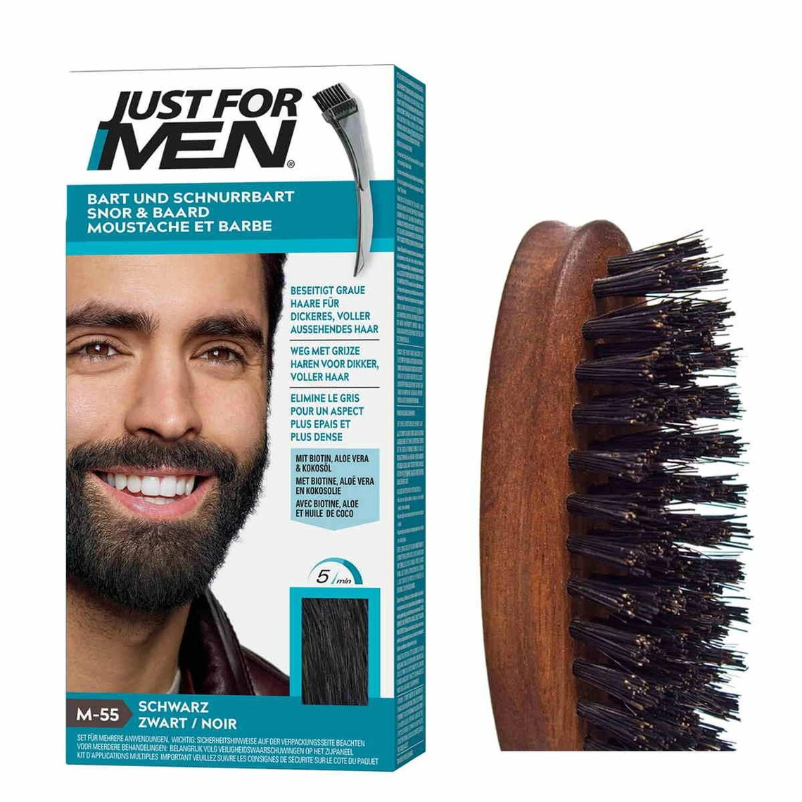 Ce PACK COLORATION BARBE NOIR NATUREL et BROSSE À BARBE contient une BROSSE A BARBE de la marque Plisson fabriquée à la main. Elle est rehaussée d’un coussinet en latex. Son caractère antistatique lui permet de s’adapter facilement à tout type de barbe. La COLORATION BARBE NOIR NATUREL de la marque JUST FOR MEN quant à elle s’utilise simplement et agit en 5 minutes pour une tenue longue durée. Sa formule exclusive True Color cible uniquement les poils gris et vous donne une couleur naturelle. Sans ammoniaque, elle respecte vos poils.
