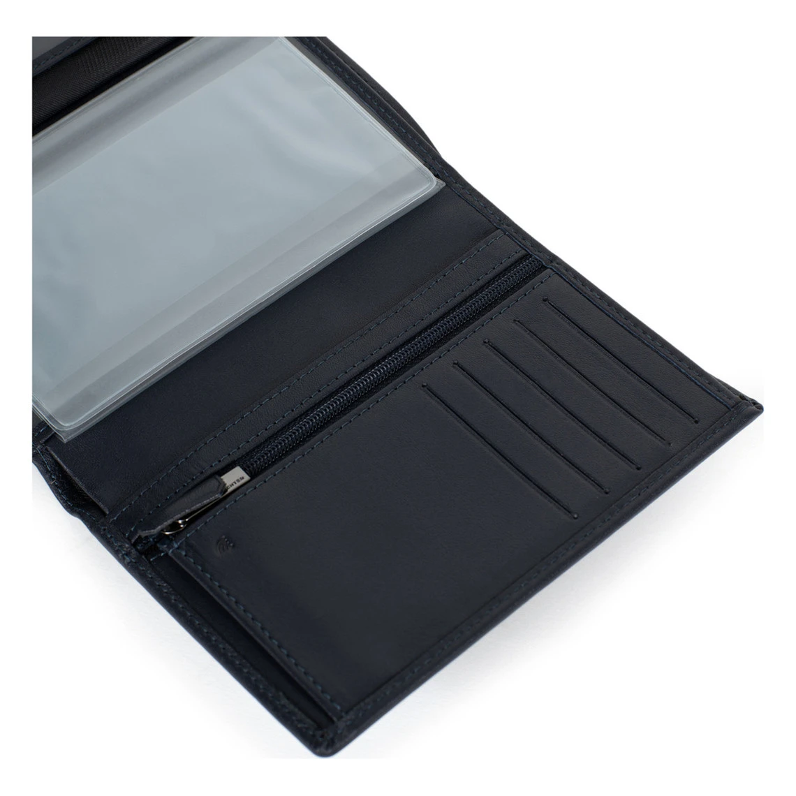– Intérieur : 3 volets. 1 porte-monnaie zippé. 5 poches plates (dont 3 à vue transparente). 10 emplacements carte. 1 poche billets. 1 étui plastique amovible pour carte grise.