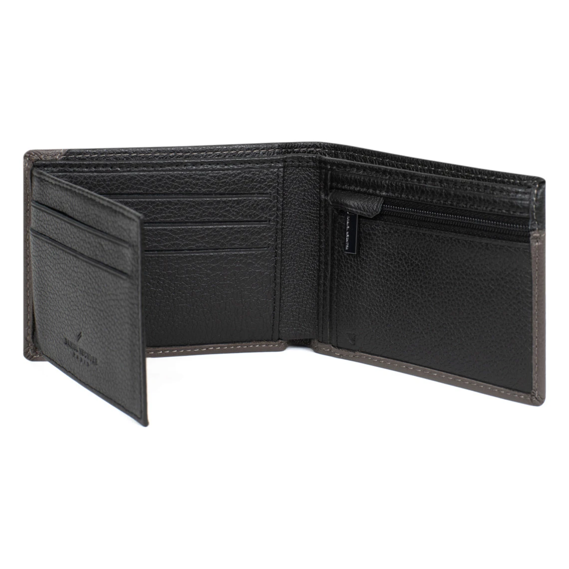 – Intérieur : 2 volets. 1 porte-monnaie zippé. 3 poches plates (dont 1 à vue transparente). 5 emplacements carte. 2 poches billets.