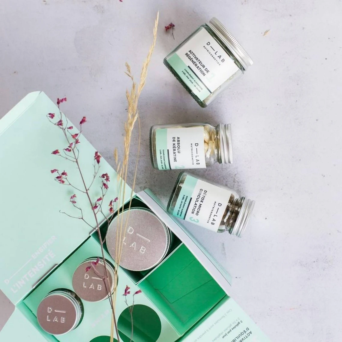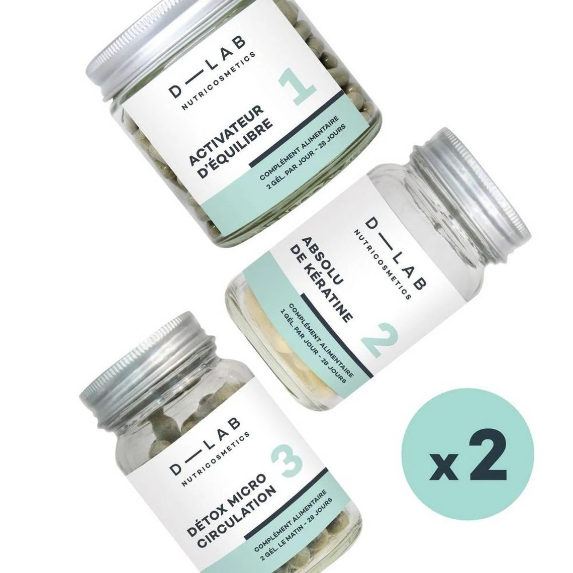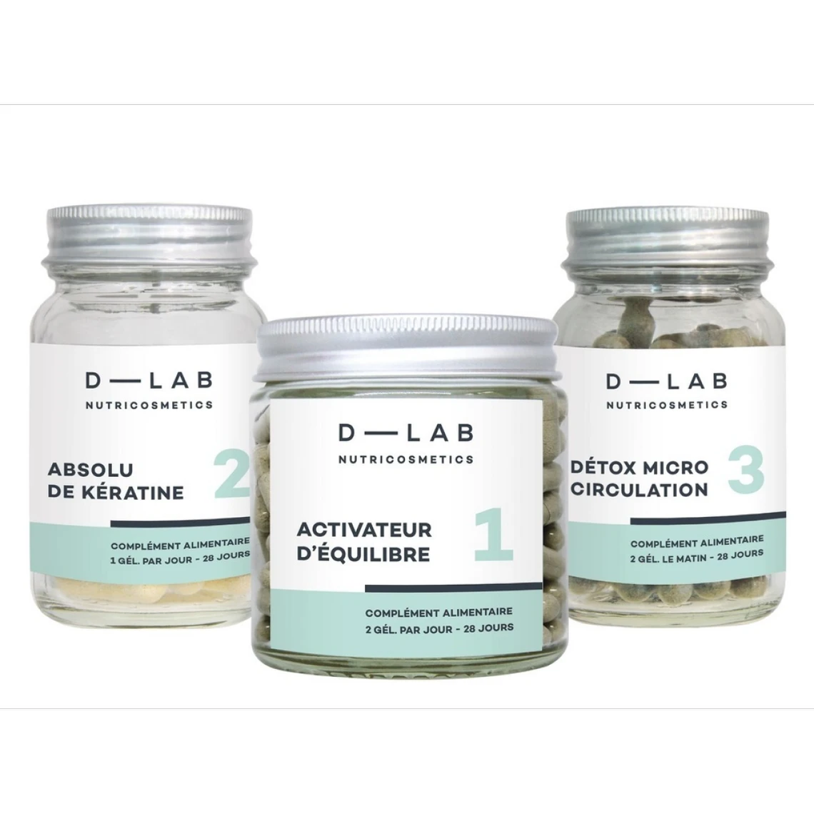 Prendre quand vous voulez dans la journée, 1 gélule de l’Absolu de Kératine et 2 gélules de l’Activateur d’Équilibre et du Détox Microcirculation.