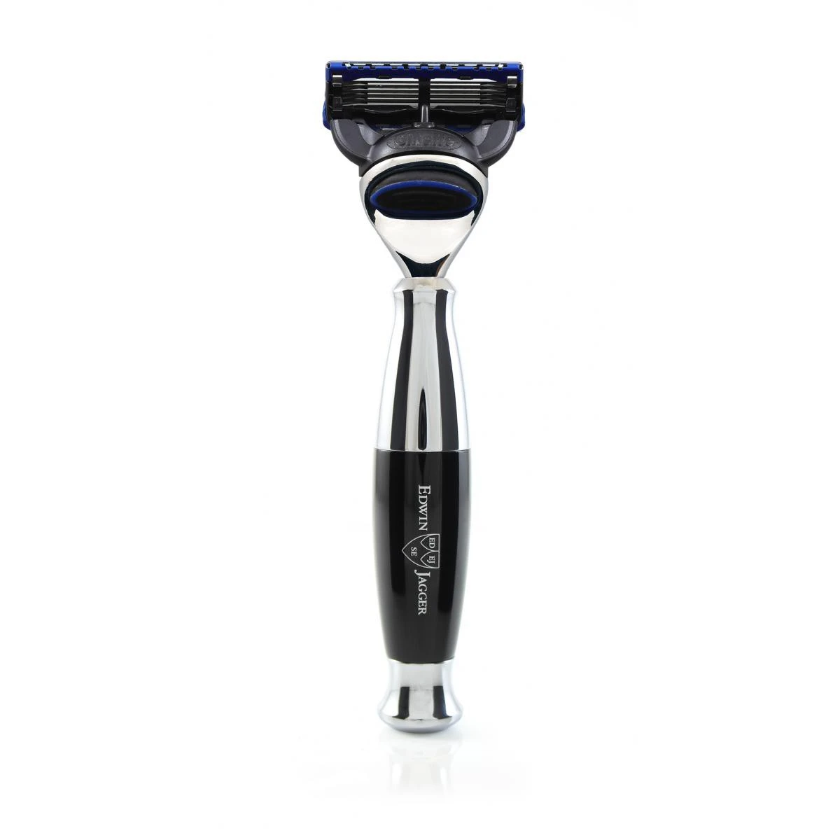 Edwin Jagger Black & Chrome Fusion Razor. A smart, contemporary style razor, fitted with Gillette Fusion head. The well balanced handle is finished with bright chrome plated collar and end cap. Fusion cartridge systems are very safe and deliver a lubricated, close shave. Replacement blades are available in most supermarkets and chemist shops. Also available with a matching black shaving brush and gleaming chrome stand.
