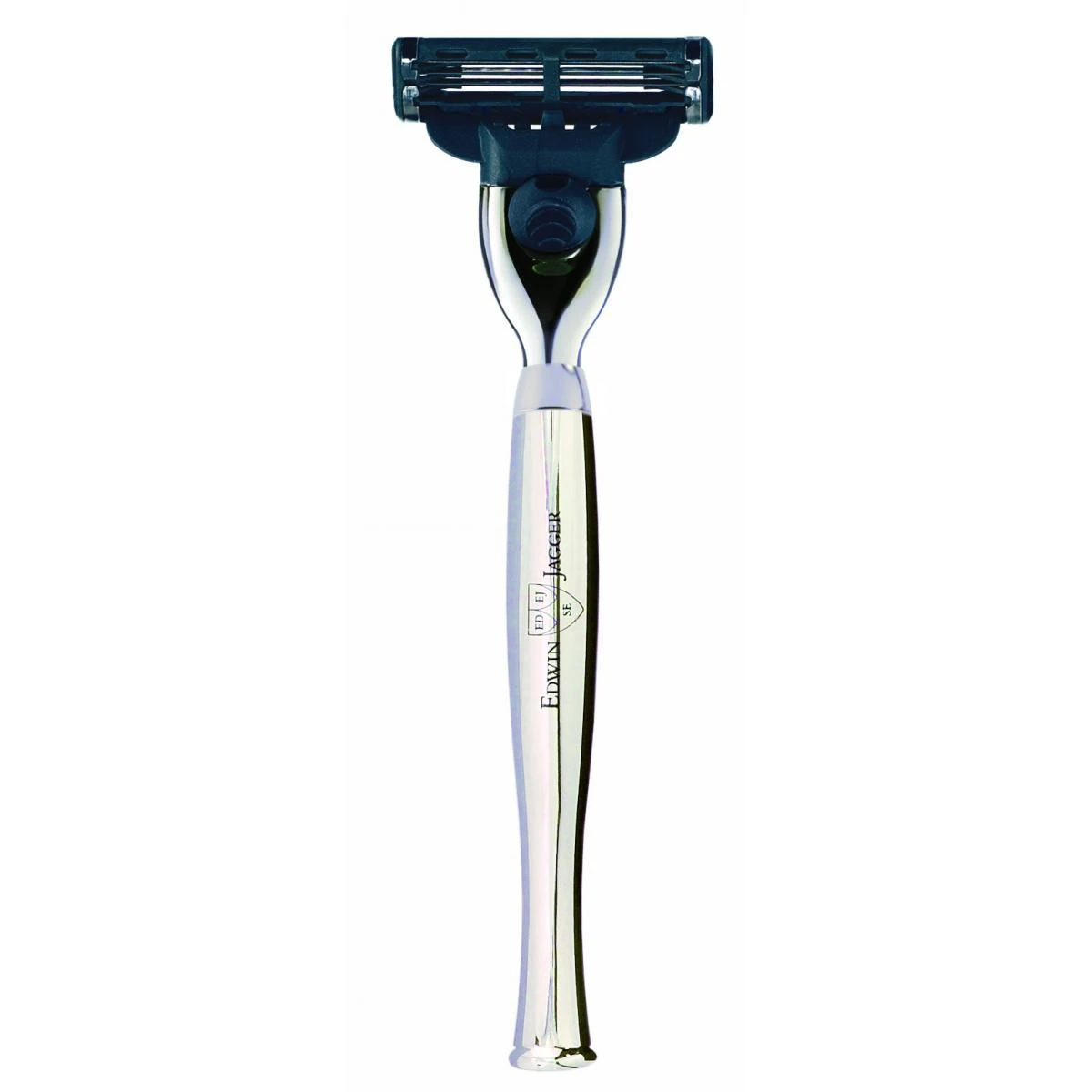 Edwin Jagger Chrome Mach3 Razor. Contemporary, chromed handle and neat chrome trim. Offers a comfortable, balanced shave. Comes with one Gillette Mach3 cartridge blade included. Made with Gillette Genuine Parts. Part of the Diffusion 72 range, also available with a matching chrome shaving brush and gleaming chrome stand.