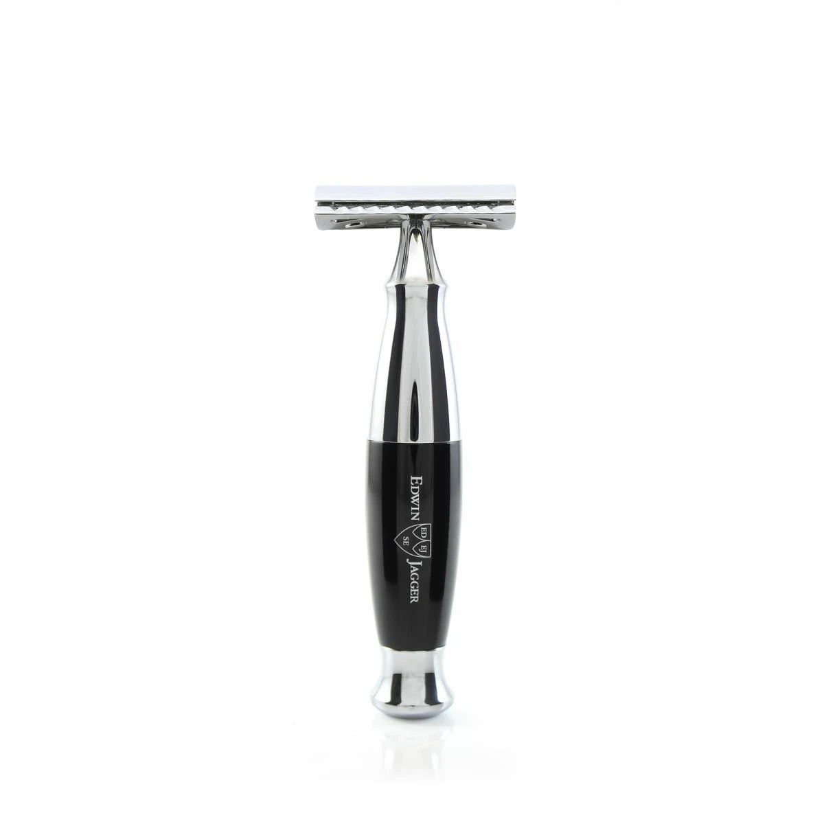 Edwin Jagger Black and Chrome DE/Safety razor. Fitted with the latest precision Edwin Jagger DE blade head, which has created great interest among experienced wet shavers. The DE blade offers a simple but highly effective, single cutting action similar to that of open bladed cut throat razors. Also available with a matching black shaving brush and gleaming chrome stand.