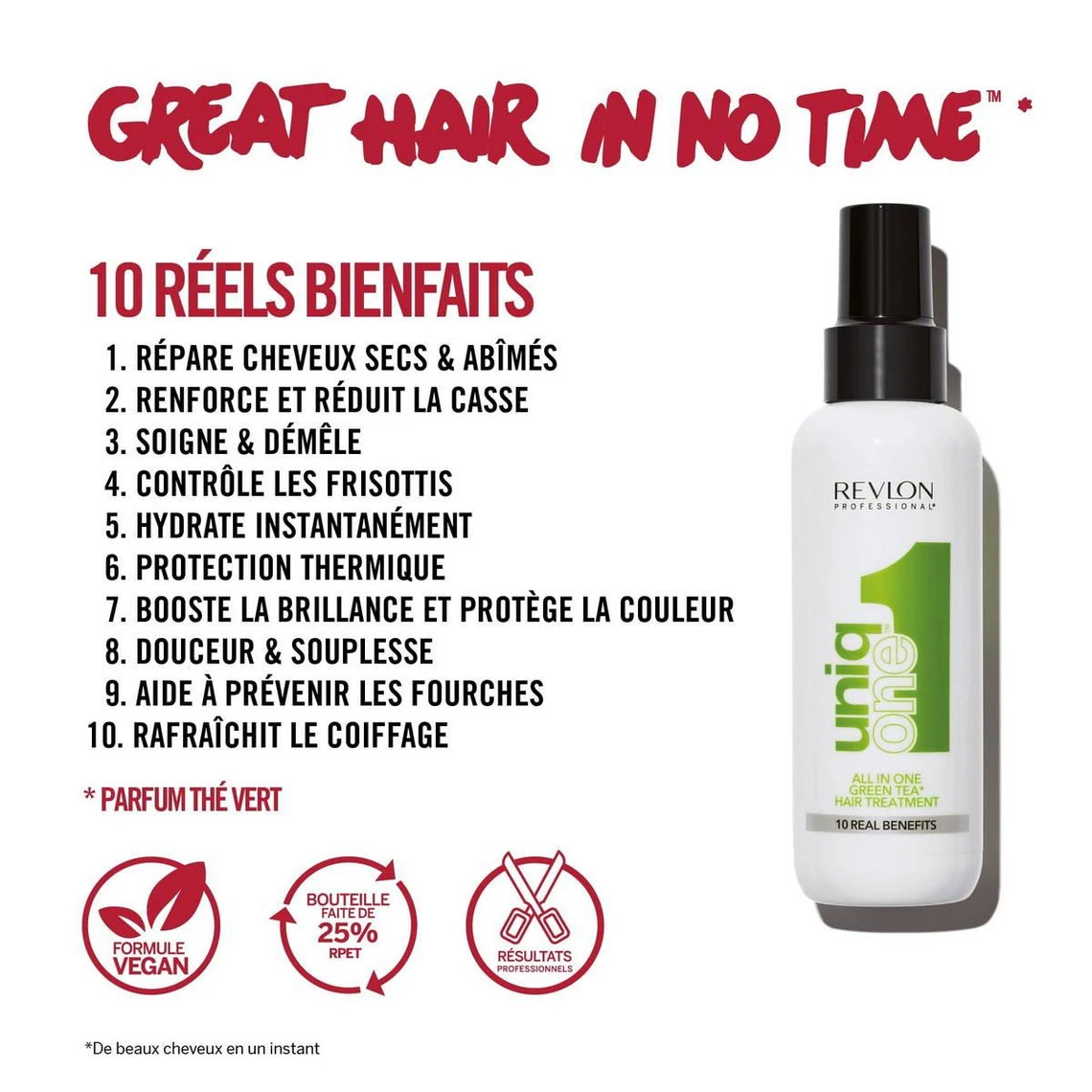 « GREAT HAIR IN NO TIME Votre temps est précieux. Le traitement capillaire UniqOne offre 10 bienfaits en un seul produit spectaculaire sans rinçage : des résultats professionnels en un clin d’œil, pour que vous ayez plus de temps à consacrer à des choses précieuses. »
