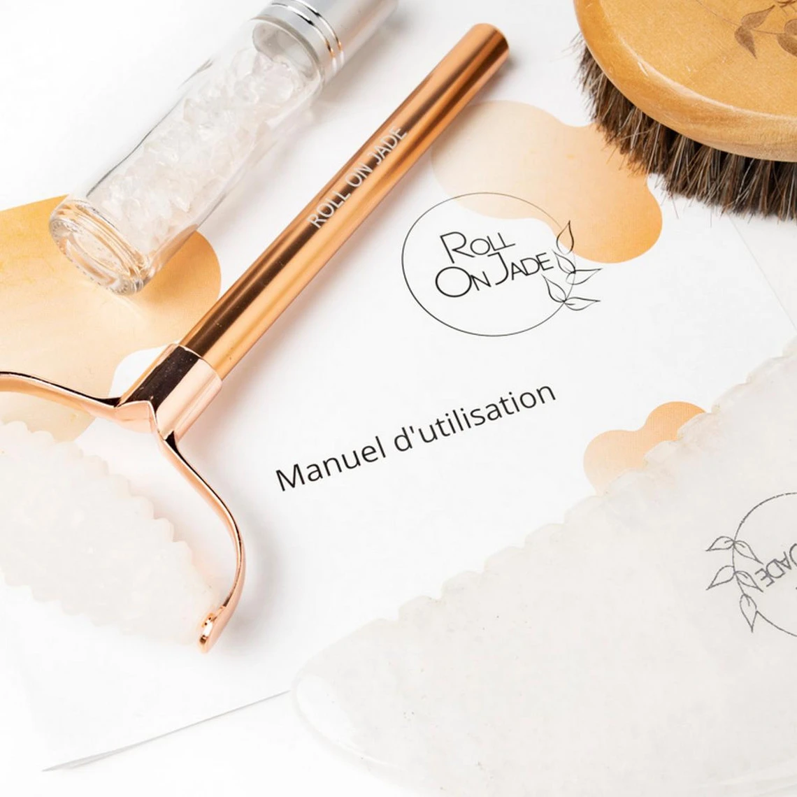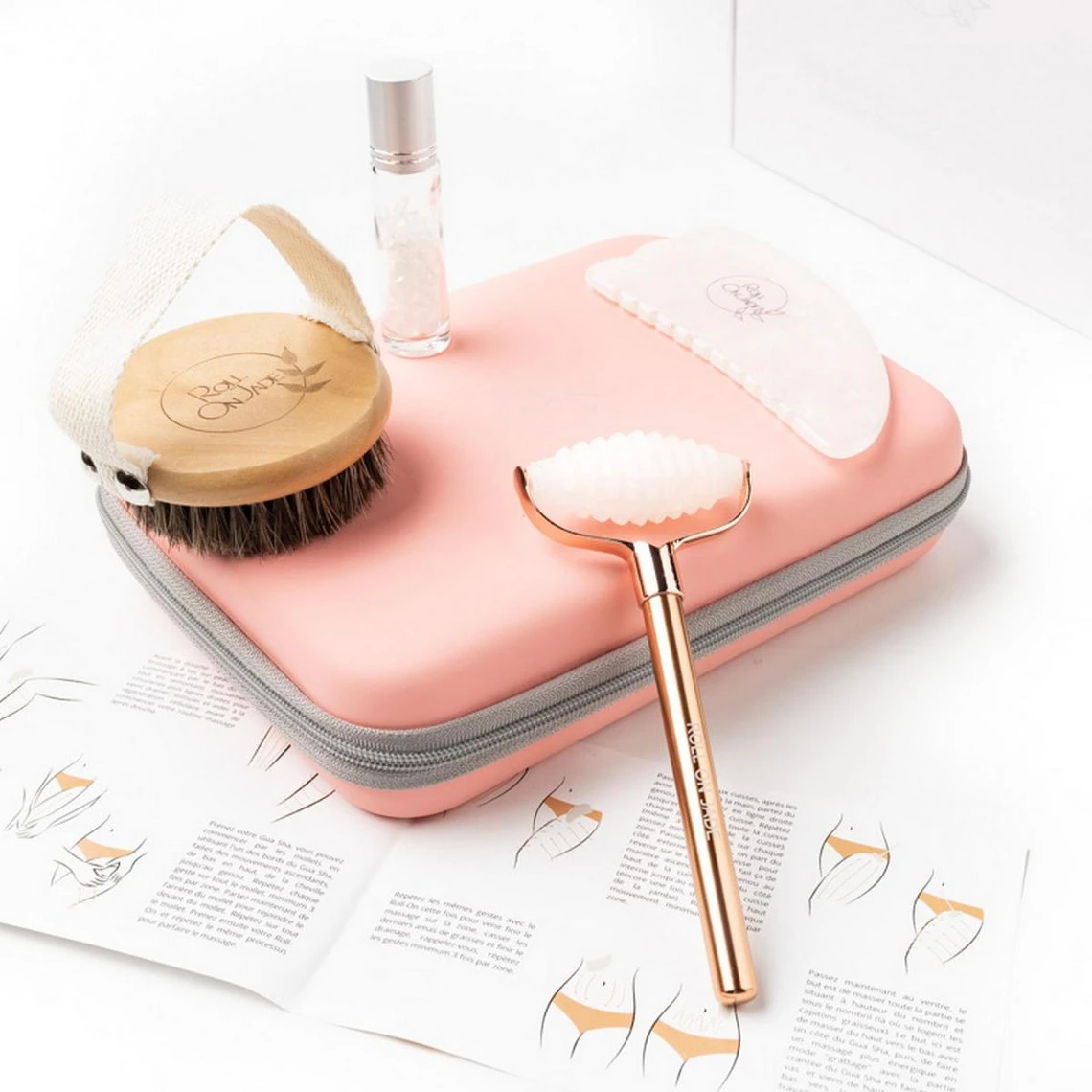 Le gua sha et le roll-on vous aident à lutter contre la graisse et la rétention d’eau. La brosse de brossage à sec prépare votre corps pour le massage. La fiole infusée sert à fabriquer votre huile ciblante fermeté.
