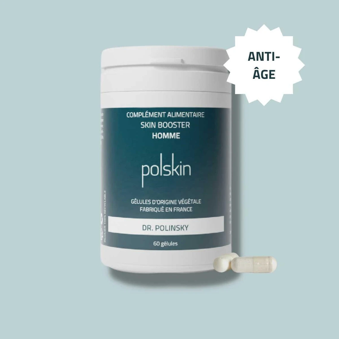 Prenez soin de votre peau avec le Skin Booster, Gélules Soin, Homme de chez Polskin. Alliant les bienfaits de l’acide hyaluronique, de la vitamine C et du collagène, il aide à réduire les signes du vieillissement et à rendre votre peau plus douce et lisse.