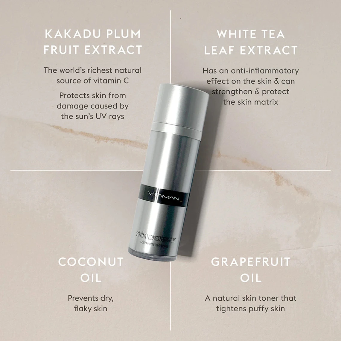Le SOIN PROTECTEUR VISAGE de la marque australienne VITAMAN se compose d’Aloe Vera connu pour ses vertus nourrissantes, de fleur de rosella sauvage et de pépin de raisin, un antioxydant puissant qui protège les cellules de la peau contre le vieillissement de la peau prématuré. Rempli de vitamine A, il protège les cellules de la peau des agressions extérieurs.